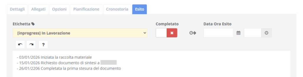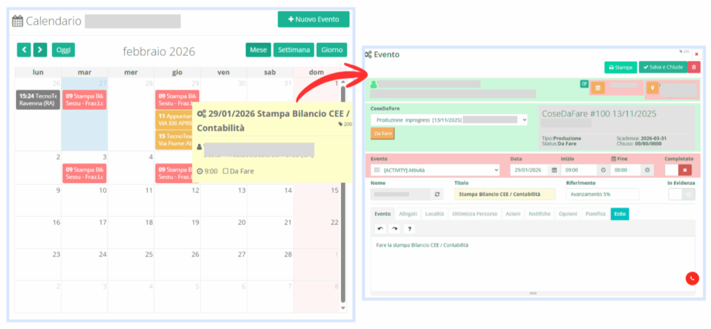 Dal calendario è sempre possibile richiamare l’attività collegata, aggiornarne lo stato e modificare la percentuale di completamento, fino al raggiungimento del 100%. Un ciclo fluido, che rispetta il ritmo di chi lavora.